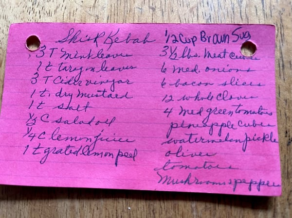 My mom remembers eating shish kebab growing up, so the recipe has been in our family for decades! Shish kebab is a traditionally Mediterranean dish of skewered meats and vegetables. I wouldn’t say that ours has Mediterranean flavors, but it’s unique and delicious. I remembered the marinade’s distinct vinegary smell, but I had no idea what was actually in it, until I recently asked my mom for the recipe. She sent a photo of the recipe card and laughed when I called back and asked for the instructions.