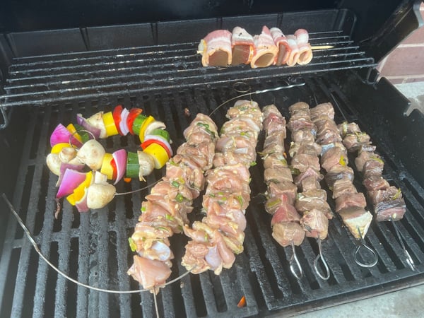 You’ll need 1/3-1/2 a strip of bacon depending how large the pickle pieces are. You’ll wrap the bacon around the pickle, secure it with a toothpick, and skewer those, separate from the meat and vegetables. Cook them on the rack of your grill, or indirect heat, for about 20 minutes, until the bacon fat is rendered and then finish then directly on the grill.