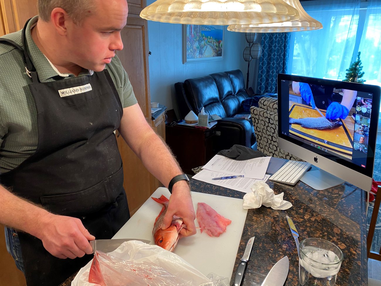 The Fish Butchery and Cookery class was intriguing to John since he had never worked with whole fish before. "I was able to angle the camera so that the chef could watch and give me immediate feedback on how I was doing. Executive Chef Lisa Counts watched me and made sure I was making the right cuts in the right spots," said John. He says the real-time feedback that our chefs provide in our virtual classes is invaluable. He also loved the ability to ask questions as he went through the cooking process. "How do you know how much oil to put in he pan? How do you know what you are doing rather than just following the steps in the recipe? That's valuable information," said John.