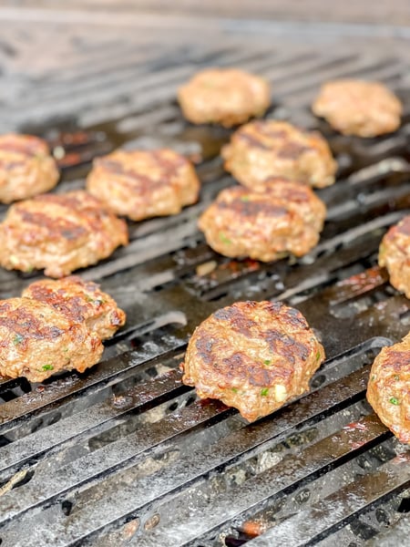 Evenly divide the ground beef mixture into four equal portions, that are approximately 1/2-inch thick. Lay the patties on a parchment-lined sheet tray, and season the outside of each patty with additional salt and pepper to taste. My tip is to refrigerate until you are ready to grill!