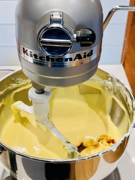 3. Increase speed to medium and add eggs one at a time, beating each egg at least 15 seconds before adding the next. Scrape down sides of bowl, then reduce mixer speed to medium-low. Add cream, salt, and vanilla and beat until combined, about 30 seconds.