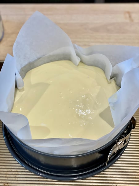 5. Pour batter into prepared pan, and using a silicone spatula smooth out the batter. Bake cheesecake until deeply golden brown on top and still very jiggly in the center, 60-65 minutes.