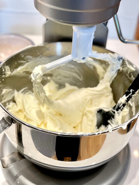 2. Beat cream cheese and sugar in the bowl of a stand mixer fitted with the paddle attachment on medium-low speed, making sure to scrape down the sides of the bowl, until the mixture becomes very smooth, no lumps of cream cheese remain, and the sugar has dissolved, about 2 minutes.