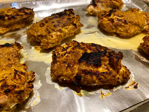- Place the marinated chicken on the prepared sheet tray, and broil until lightly charred.