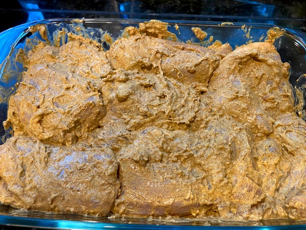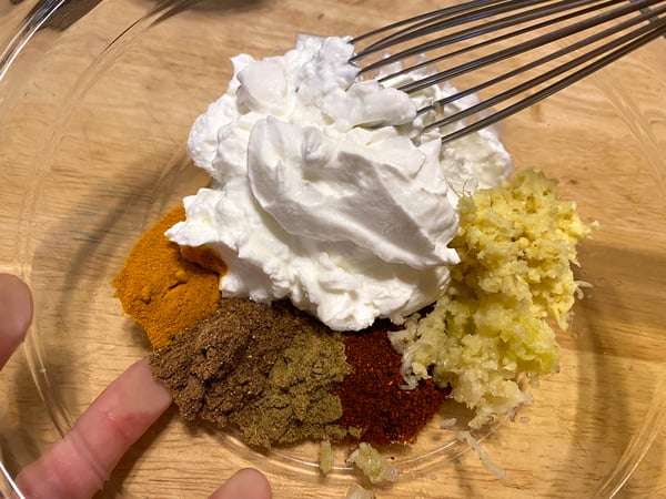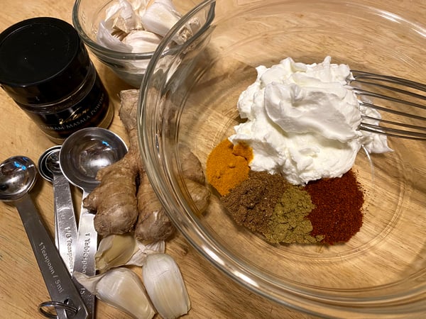 The first step is to marinate the chicken in a yogurt-spice mixture. This not only seasons the chicken, but the acid in the yogurt helps tenderize the poultry.