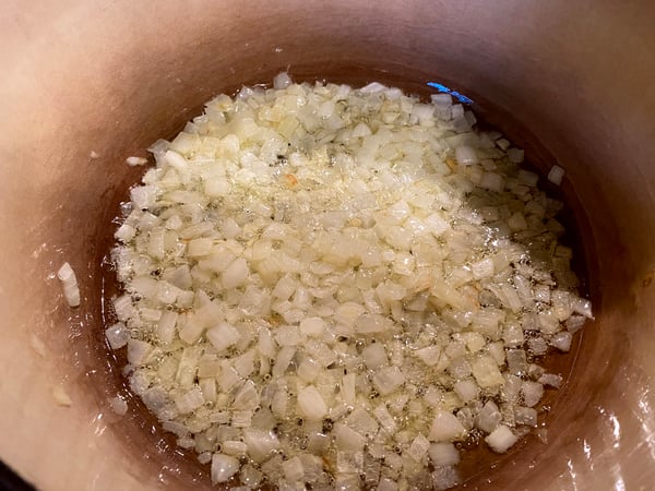 - While the chicken is marinating, prepare the butter sauce. Heat a French oven or saucepot over medium heat, and add the ghee. Sauté the onions, stirring occasionally, until lightly caramelized, 5 to 6 minutes.