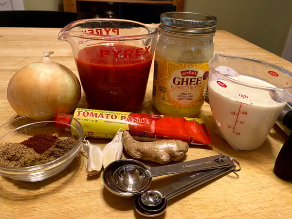 The second step is while the chicken marinates, prepare the gravy. This is where the butter comes in, specifically ghee. Ghee is butter that has all of the milk solids removed, but not before they are toasted and golden brown, giving the ghee a nutty flavor. Removing the milk solids also greatly increases the smoke point of the butter, allowing you to use it for high-heat cooking.