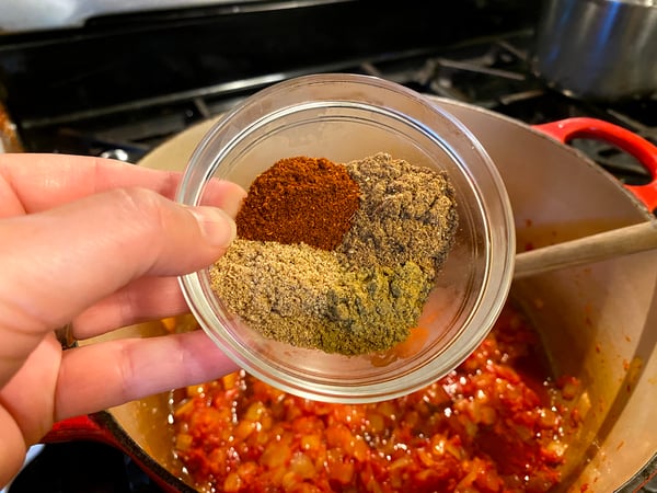 It keeps getting better because the next step is to add your spices, and cook until toasted and aromatic, which only takes about 30 seconds… be careful not to over-toast and burn your spices!