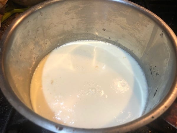 3. Over medium heat, heat 2 cups of cream and vanilla bean paste, until steaming (do not boil).