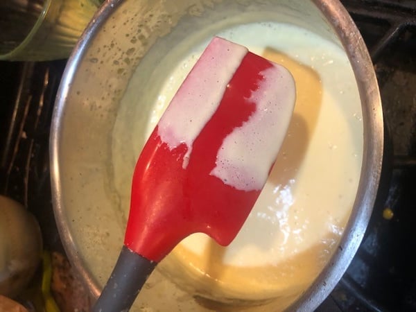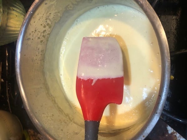 8. With the heat on low, whisk continuously until the mixture thickens and coats the back of a spoon (you should be able to draw a line through it).
