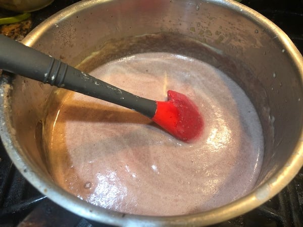 9. Stir in remaining ½ cup heavy cream, ½ cup milk, and 1 cup red wine syrup. (You can opt to strain this mixture through a fine sieve for an extra smooth texture – I did not.)