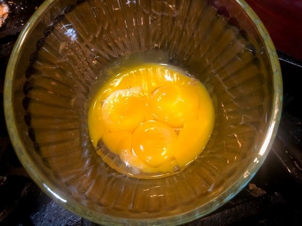 5. Temper the egg yolks by adding 2 Tablespoons of the warm cream/vanilla mixture. Whisk vigorously.