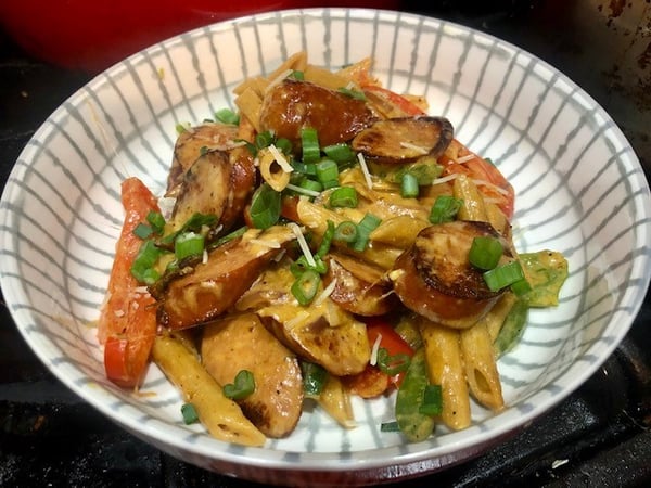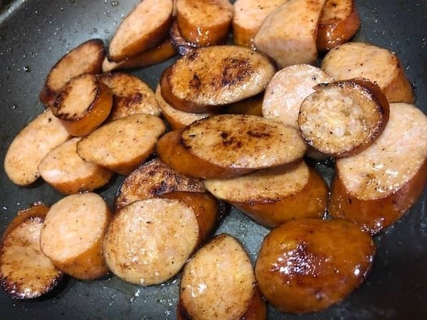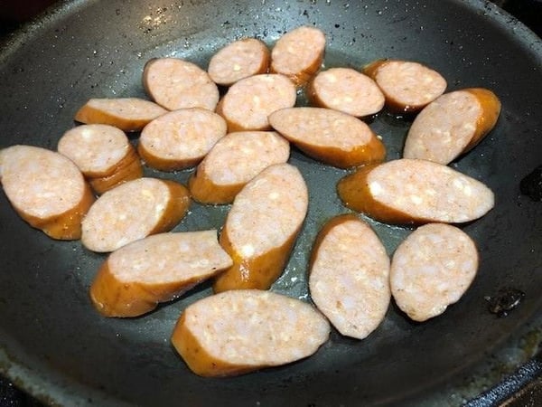 - While the pasta cooks, in a medium skillet, over medium high heat, add olive oil, and sauté the andouille until it is browned on both sides, about 5-7 minutes.