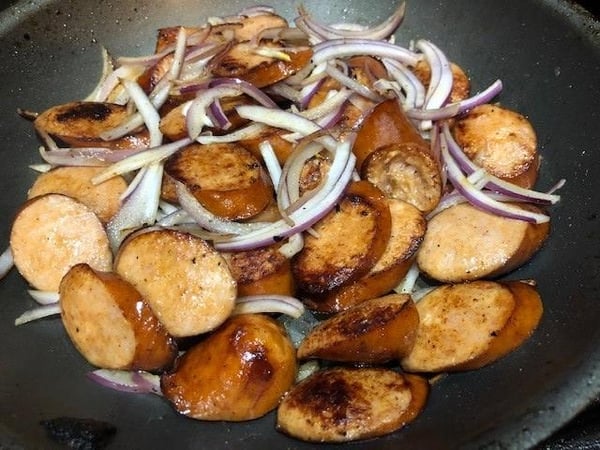 4. While the pasta cooks, in a medium skillet, over medium high heat, add olive oil, and sauté the andouille until it is browned on both sides, about 5-7 minutes.