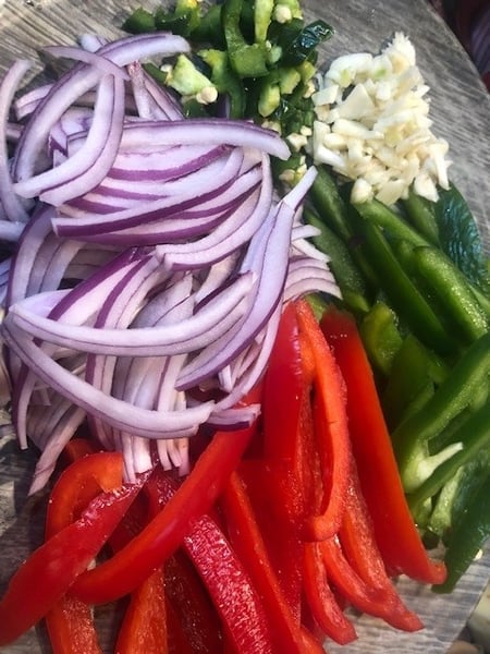 - While you are waiting for the water to boil, chop the garlic and jalapeno, slice the peppers, onions, andouille, and scallions.