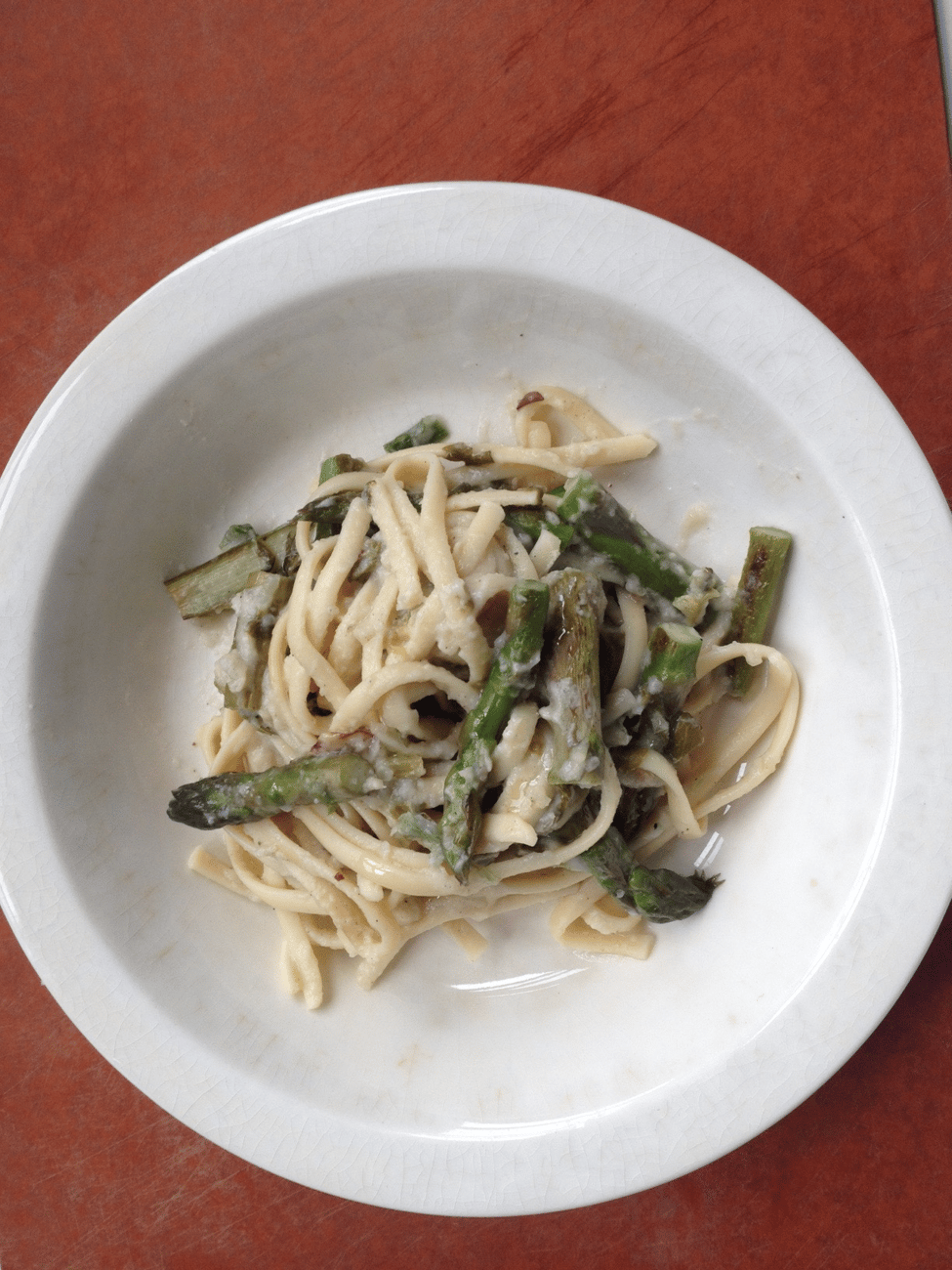 3. In the same skillet, sauté chard leaves until wilted and asparagus is bright green. Add puree to the skillet and cook 2 minutes, stirring constantly. Off the heat, add Parmesan and stir. Add a bit more liquid (pasta water or milk) if the sauce is too thick.