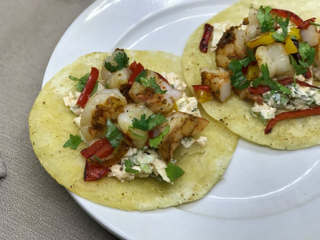 Toss the remaining ½ teaspoon Creole seasoning over the shrimp, add the ½ teaspoon grapeseed oil to the pan, and cook shrimp for 2-3 minutes, or until opaque and cooked through. Remove to the plate with the peppers. Heat the corn tortillas in the same pan on both sides until the tortillas are pliable.