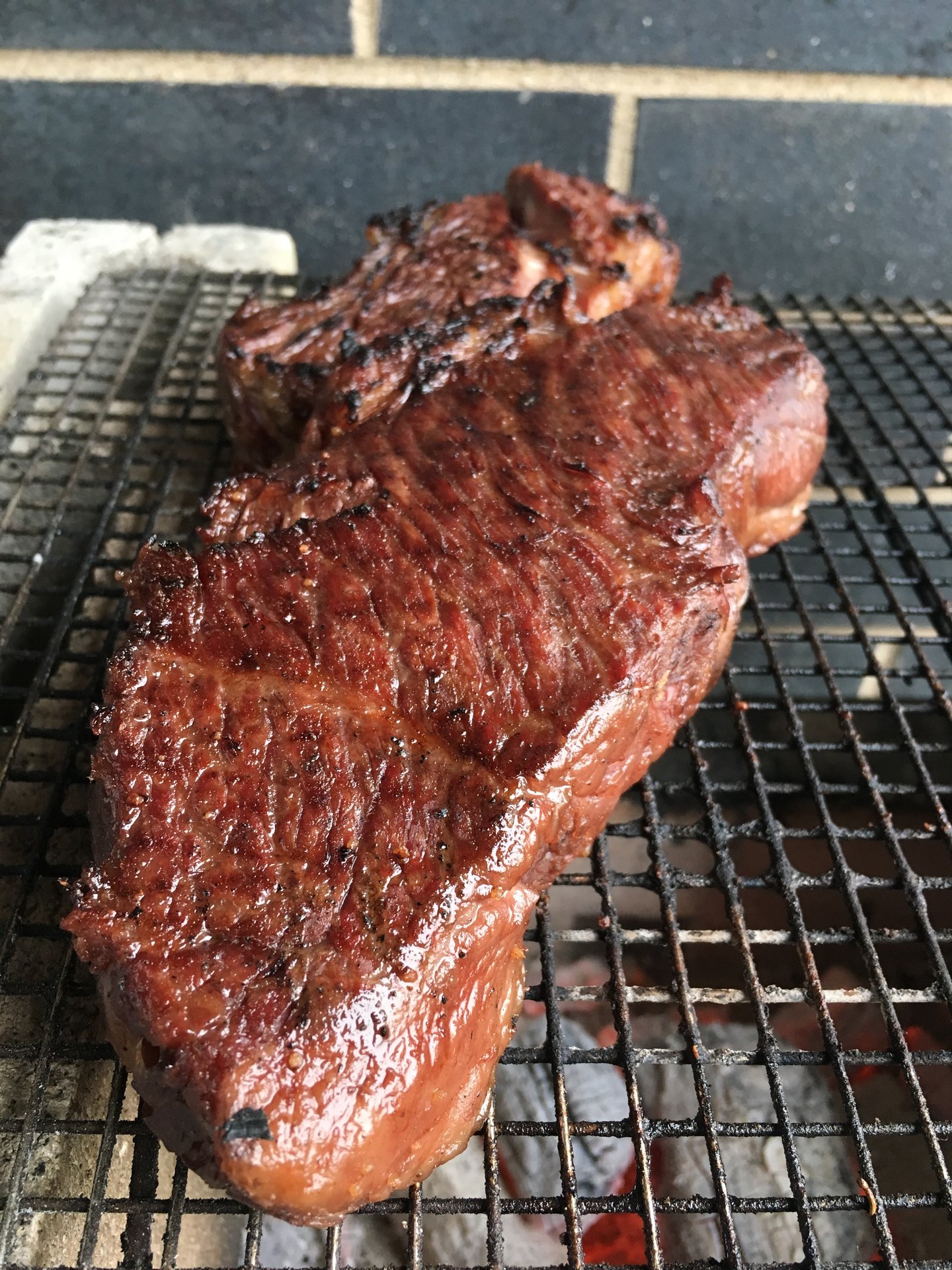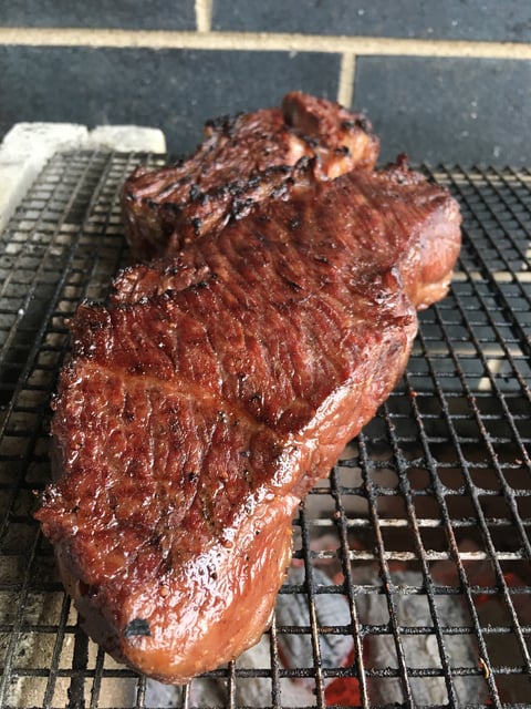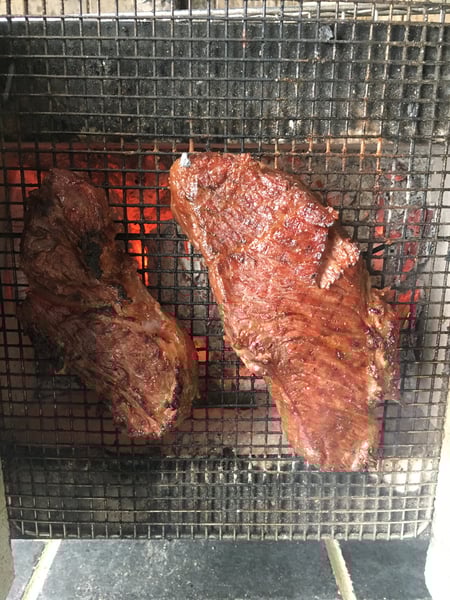 Now we can take our seasoned cut of meat, and place it on our elevated grill grate, and kinda forget about it. The temperature this far above the grill is low enough that we aren’t really cooking the meat quite yet. What we’re doing is more akin to a process called tempering. When we temper we leave our protein out at room temperature for at least half an hour before cooking to help the meat cook evenly and quickly. What we're doing here is kind of a super-temper; we’re bringing the meat as close to its finished done-ness temperature (for the purposes of this post that's medium rare (around 125-130 degrees F) as we can, all the while letting it slowly accumulate a little smokey grill flavor from the charcoal below.