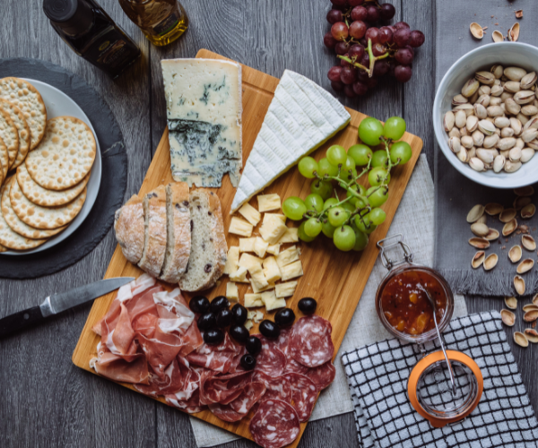 In my opinion, great cheese boards come down to the balancing of cheese textures and sides on the board. What I mean by this, use cheeses that have different types of kinds of milk used to make them. This means getting a cheese made with cow’s milk, one made from goat’s milk, one from ewe’s milk, etc. The different types of milk give a different mouthfeel and flavor to eat one. Then I take a look at the textures on the boards and if I have all hard cheese, then I may want a soft cheese, or blue cheese to lighten up the board. Usually, three to five types of cheeses are enough to please even pickier eaters.