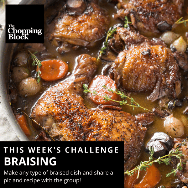 Braising is this week's challenge for our private Facebook group of home cooks. Join, make a braised dish like this Chicken Cacciatore or Coq au Vin with us on Thursday, and share your creations with the group.