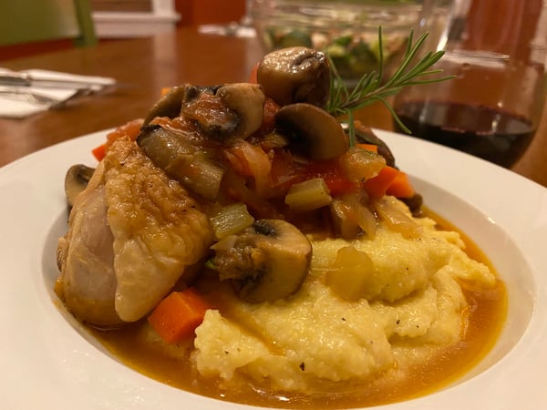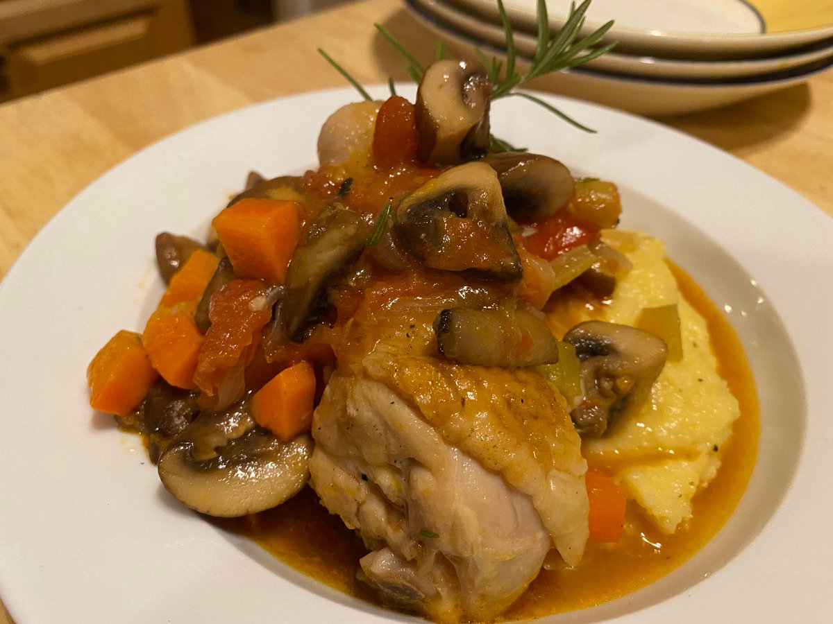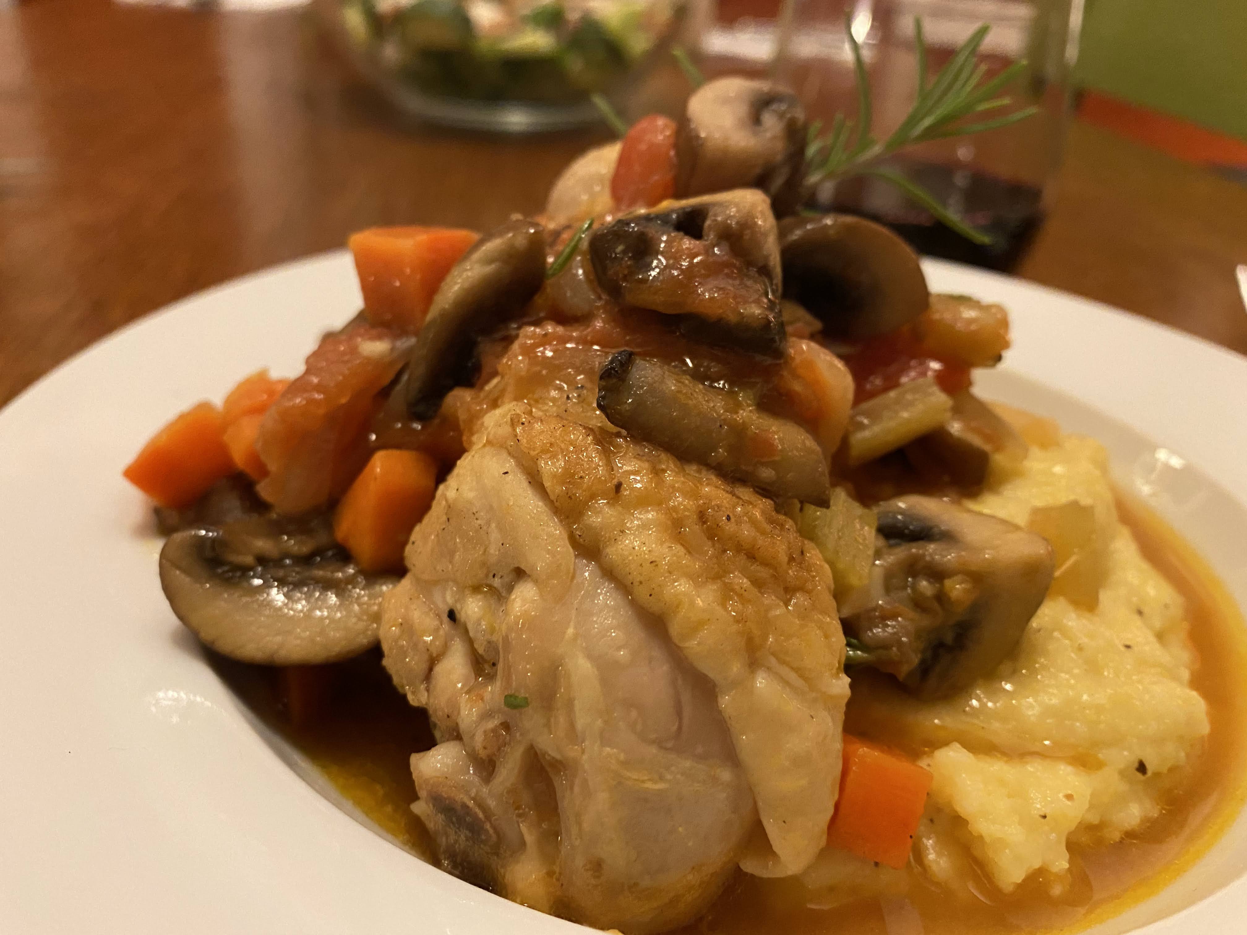 I typically like to serve my braise with a complementary starch or grain such as mashed potatoes, quinoa or farro to soak up the braising liquid. To stick with the Italian theme, I made a pot of polenta to accompany the cacciatore, which was an excellent pairing for the chicken!