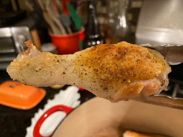 - Heat a heavy pot with a lid over medium-high heat, and add the oil. Brown the chicken, skin-side-down, until golden brown and crisp, 4 to 5 minutes. Flip the chicken over and repeat on the second side. Remove the chicken from the pan and set aside.
