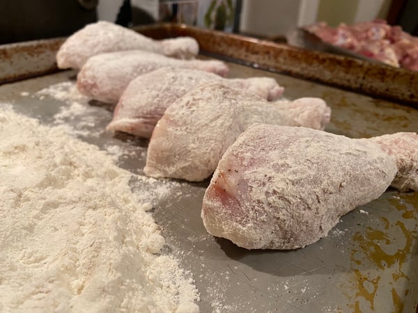- Season the chicken with salt and pepper to taste. Dredge in flour, shaking off any excess.