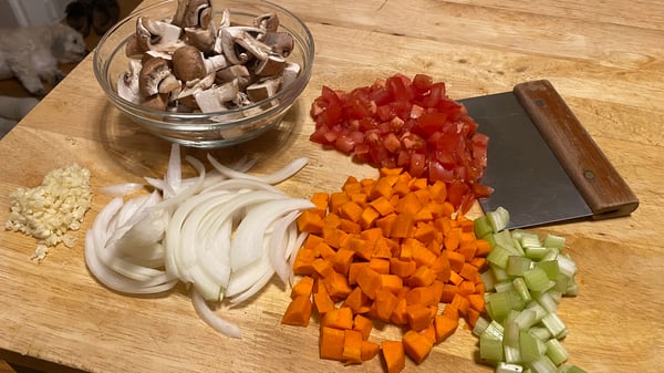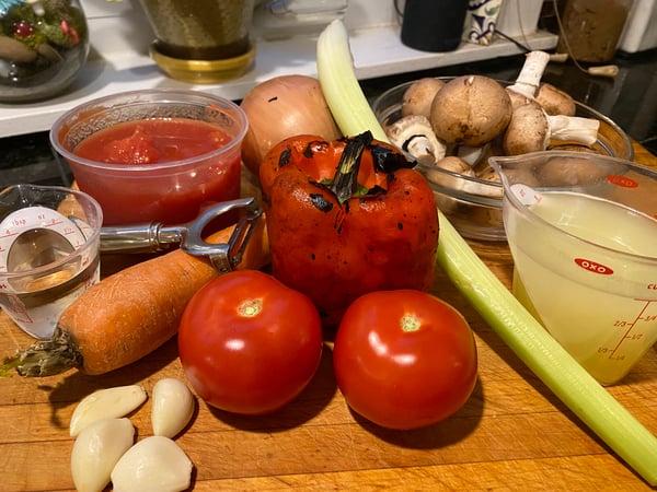 3. In the same pan, sauté the mushrooms until golden brown. Add the onion, celery and carrot and saute until softened. Next add the roasted red pepper along with the garlic, and cook for one additional more.