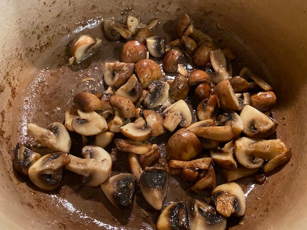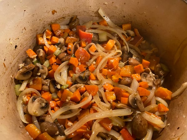 - In the same pan, sauté the mushrooms until golden brown. Add the onion, celery and carrot and saute until softened. Next add the roasted red pepper along with the garlic, and cook for one additional more.