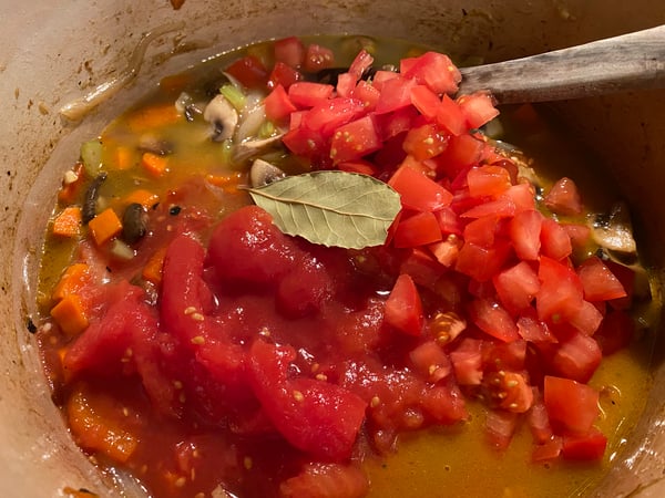 5. Add the canned and fresh tomatoes and the bay leaf. Season the sauce with salt and pepper and return the chicken to the pan.