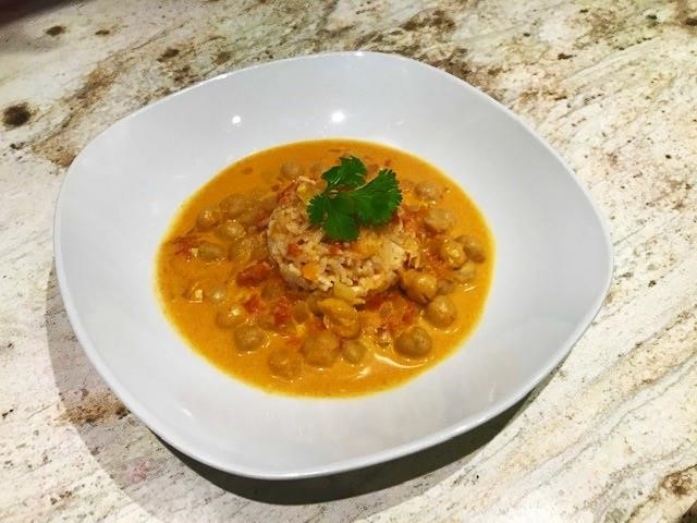 4. Add chickpeas and coconut milk. Keep heat around medium/ medium low and stir often. Dish is ready to serve when chickpeas are hot – about 15 minutes.