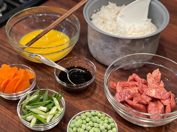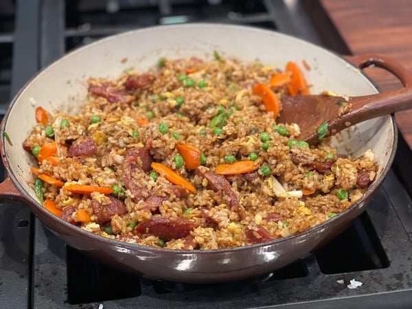 Now that you have the basic staples in your pantry, I want to offer you a classic recipe to use them in. Fried rice is a great place to start as everyone seems to love it! This version includes Chinese sausage, which I think you will love if you have never tried it, but feel free to leave it out.