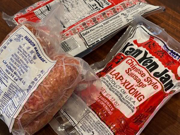 - 6 ounces of Chinese sausage (Lap-Xuong) cut on the bias