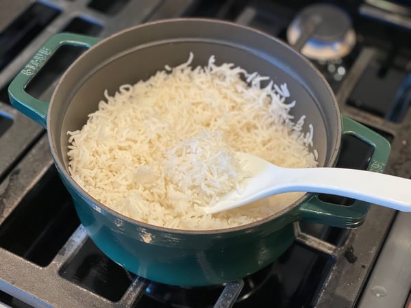Soak 2 cups of white rice in cold water for 15 minutes. Drain rice and place in a 3-quart sauce pan and cover with 3 1/2 cups of water. Bring rice to a boil, once it comes to a boil turn the heat down as low as possible and cover. Let cook for 15 minutes. Turn off the heat and let rest for 5 minutes. Spread rice out on a sheet pan and put in the refrigerator until completely cool. Cover once cool.
