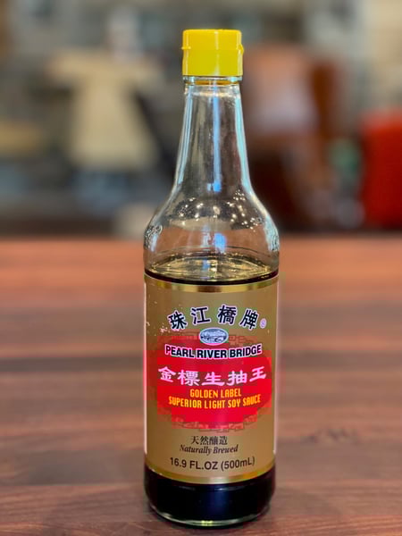 Light soy: Probably the most commonly used condiment and one not to be confused with regular soy sauce you find in the grocery store. The term “light” does not mean low sodium, in fact light soy sauce is saltier than dark soy sauce. Light soy sauce has a slight red hue, very thin viscosity and delicate flavor.