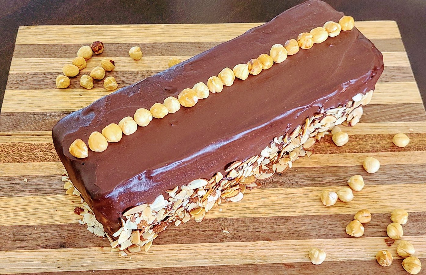 - Garnish top of cake with hazelnuts and press almonds onto the sides