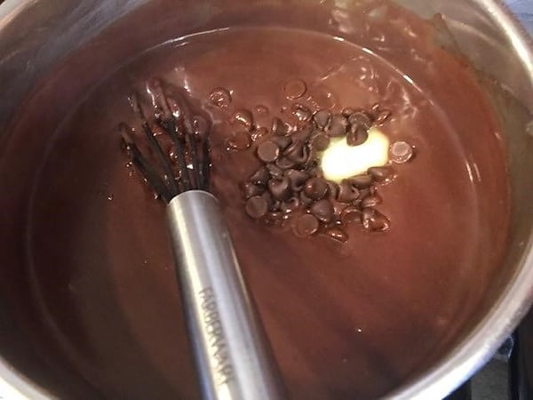- Immediately add in butter, semi-sweet chocolate chips, and vanilla. Stir until completely incorporated and smooth.