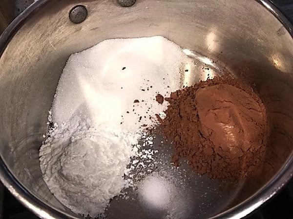 - In a saucepan add sugar, cocoa powder, corn starch, and salt. Stir well to combine.