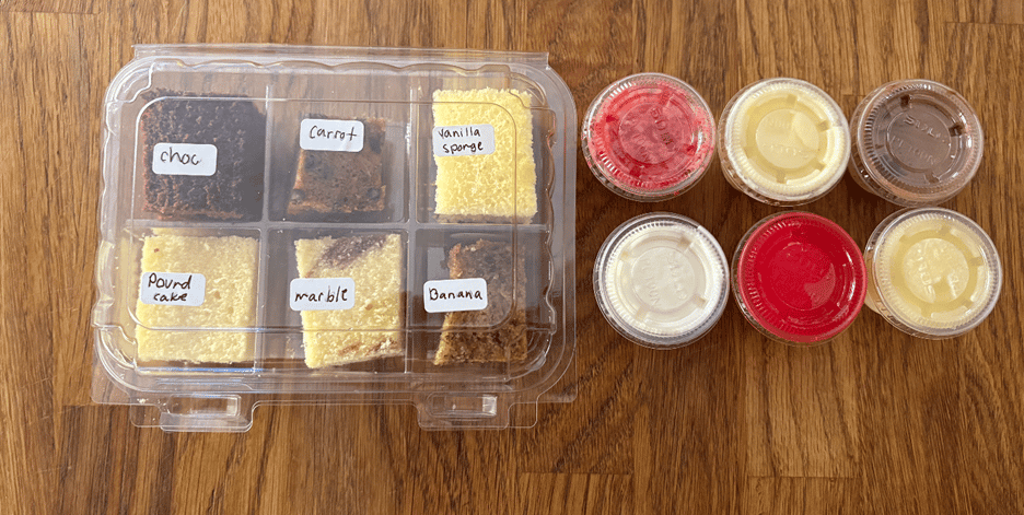We gave the bakery a call hoping to set up a formal tasting, and were pleasantly surprised to learn that they didn’t have formal tastings. Instead, we got to choose six different cake flavors along with six fillings to try. They would cut tiny pieces of each, put them in a box, and send us on our way to try at our leisure. After we chose, we just needed to call them and let them know what combination we chose, and when we needed the cakes done by. Easy-peasy, no-hassle, perfect for us. The following are our flavor sample choices, and what we thought of them!