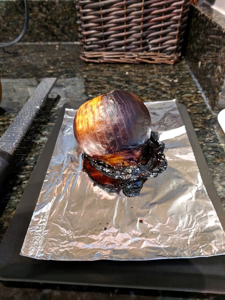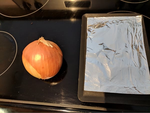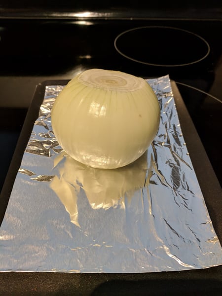 2. Place the onion on a pan with aluminum foil under it and place in a cold oven. Turn the oven to 400°F and cook until onion is fully burnt/charred on the outer layers, about an hour and a half.