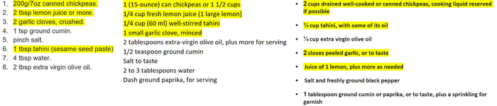 I always tell my students not to take the first recipe you find and run with it. With the ease of searching on the internet, you should find 4-5 recipes for the same dish and take a second to read through them and find the common denominators. If you are looking for a hummus recipe and everyone has chickpeas, tahini, garlic and lemon, you can guess that those are likely the primary ingredients you want to be sure to have. By finding these identical base ingredients, you will be able to create your own version of the recipe without stepping too far off base. Here are three different ingredient lists to make hummus with the common ingredients highlighted.