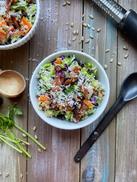 1. Bring 3 cups of water to a boil. Add broccoli and carrots and blanch for 6 minutes. Drain and finely chop and add to large bowl. Let cool for a few minutes.