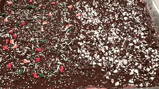 8. Place the sprinkles on top of the chocolate. Let the toffee sit until completely cool, either at room temperature or you can refrigerate.