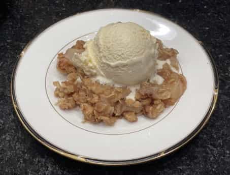 - Place filling into a baking dish and sprinkle the streusel over the top. This recipe fits perfectly in a 9 in pie dish, but use whatever baking dish you like.