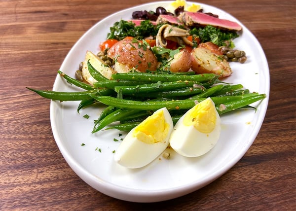 I remember when I was in culinary school in Germany many years ago, we learned about the classic dishes, and being able to make this salad was part of our exam. While it’s pretty simple in the assembly, it's composed of a lot of different ingredients: green beans, boiled potatoes, hard-boiled eggs, tomatoes, anchovies and Niçoise olives, which give the salad its name.