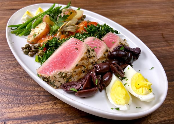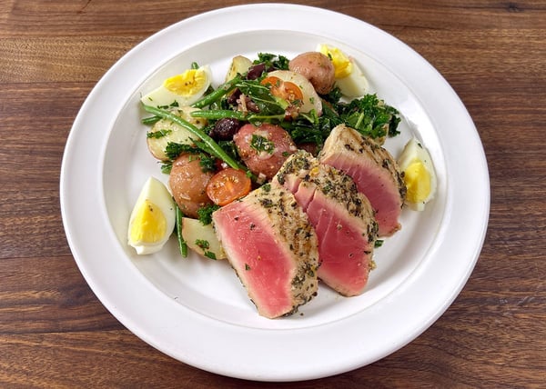 - To assemble the dish, spoon a small amount of the salad onto each plate. Top with slices of the grilled tuna and the hard-boiled eggs, and lightly drizzle with the vinaigrette.