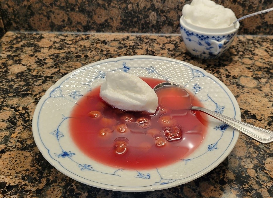 The soup is amazingly simple, utilizing canned sour cherries, thus saving the labor of pitting fresh ones. Of course, I have tried this out with fresh sour cherries I lovingly/exhaustedly pitted. As a proud scratch cook, I scoffed at the idea of using canned when fresh is available. Is it good that way? Of course! But it’s pretty good with the canned ones, too. It has always been served as an appetizer or main course, not a dessert, its garnet sheen beautiful, dappled with ruby orbs, strikingly topped with a stark white dollop of meringue.