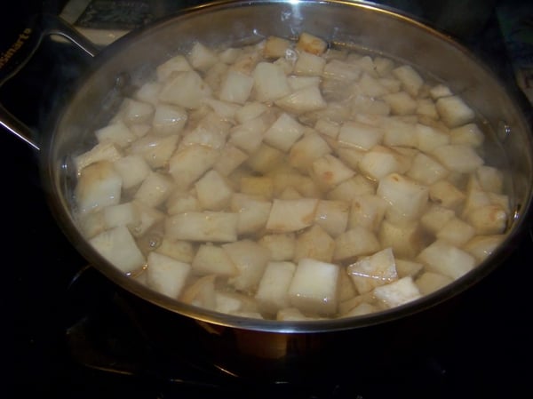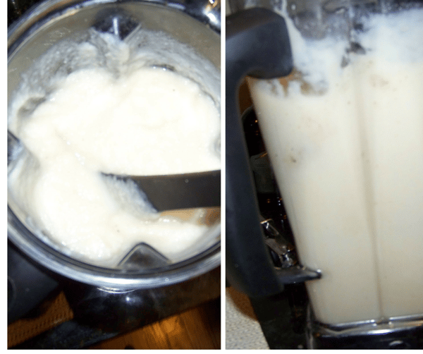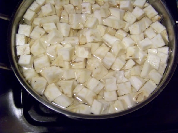 You will notice a slight color change as pieces start breaking apart when the Celery Root is getting tender. Drain water and add to your food processor orVitamix blender.