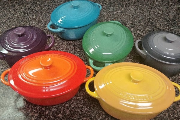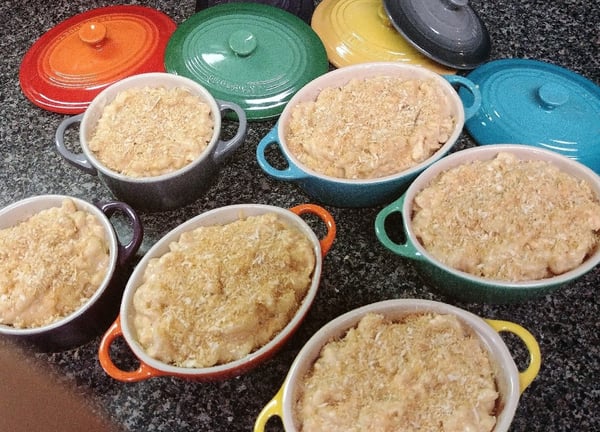 Now go ahead and butter your favorite baking dish. This time, I wanted to make individual mac & cheeses. I already had four little oval cocottes from Le Creuset and one of my rewards from the cook-off was two round ones. I love mixing colors and shapes, so these turn out to be perfect for mac & cheese! Plus, they have lids and the mac & cheese needs to first bake covered.