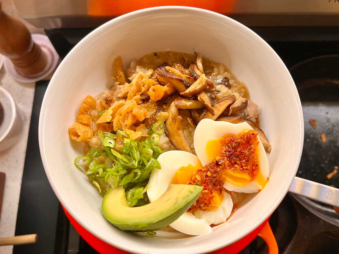 Conjee is my favorite style of the dish because I like the name and the savory rich flavors. I first made Conjee in culinary school and it stuck with me ever since. It’s a fun dish to use different styles and techniques as well as flavors, toppings, and textures! Overall it’s pretty bulletproof, hard to overcook, easy to adjust taste and consistency. All you really need is rice and a flavorful stock, everything else is there to dress it up.